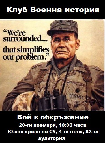 За следващата сбирка ще разгледаме боя в обкръжение в съвременното военно дело. Какви са възможностите пред обкръжените войски? Какви са проблемите на обкръжаващите и обкръжените? Винаги ли обкръжението означава поражение?