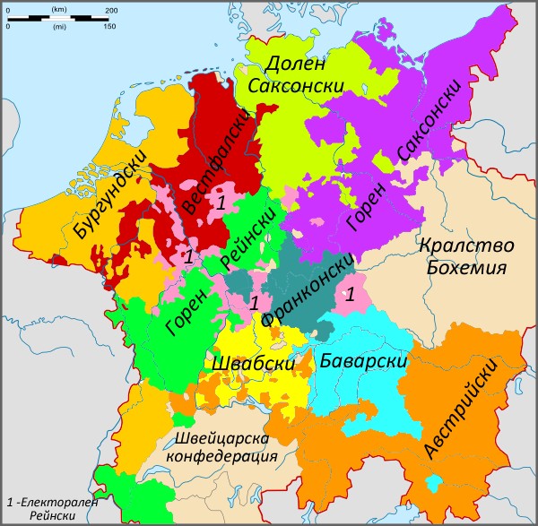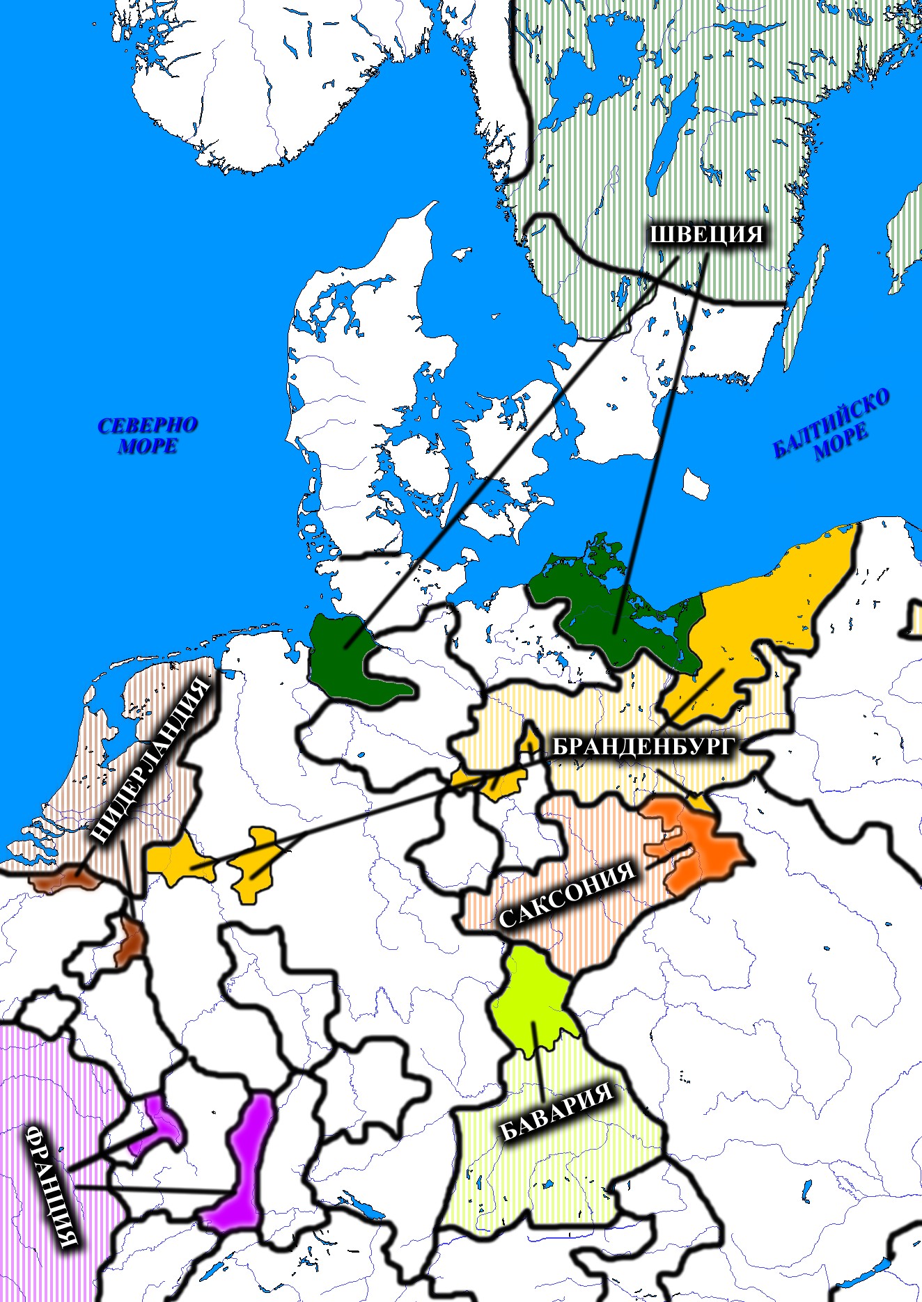 Имперските „кръгове“ към 1618г.Военните действия 1618-20г.Военните действия 1621-23г.Военните действия 1624-29Военните действия 1630-32Военните действия 1633-35Военните действия 1635-40Военните действия 1640-44Военните действия 1645-48г.Териториални промени по Вестфалския мирен договор