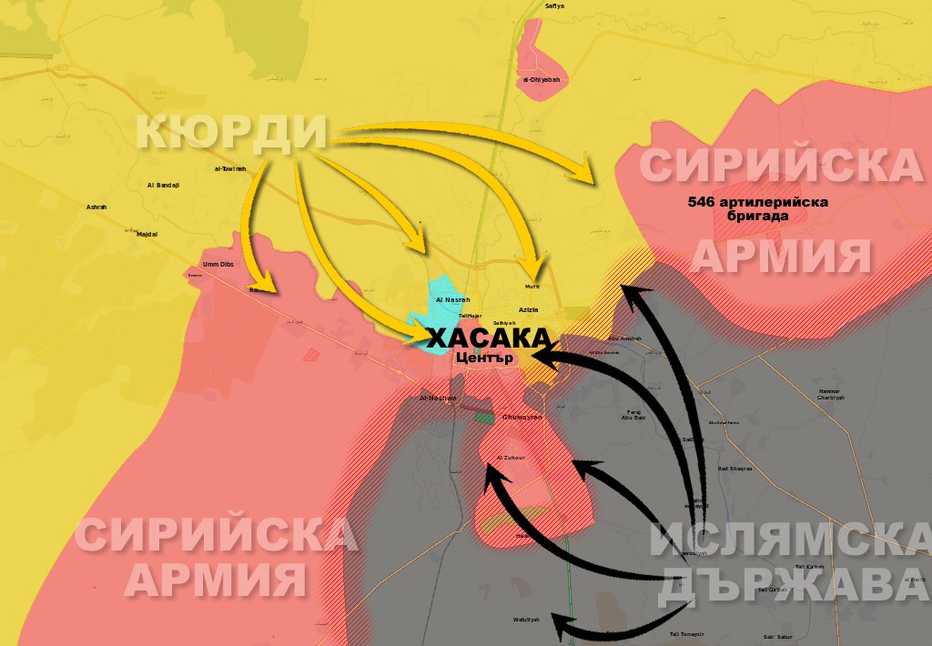 Вчера, силите на Сирийската армия започнаха да напускат позициите си, премахвайки последната бариера между кюрдите от YPG и бойците на ИД, които веднага се впуснаха в ожесточен двубой, стремейки се да запълнят отворилия се вакуум. Целта на ИД е да поставят града под пълна обсада и същевременно да прекъснат пътя към Тел Брак и от там към Камишли, от където кюрдите могат да полиучават подкрепа както от иракските пешмерги, така и от силите на ПКК в Турция.
