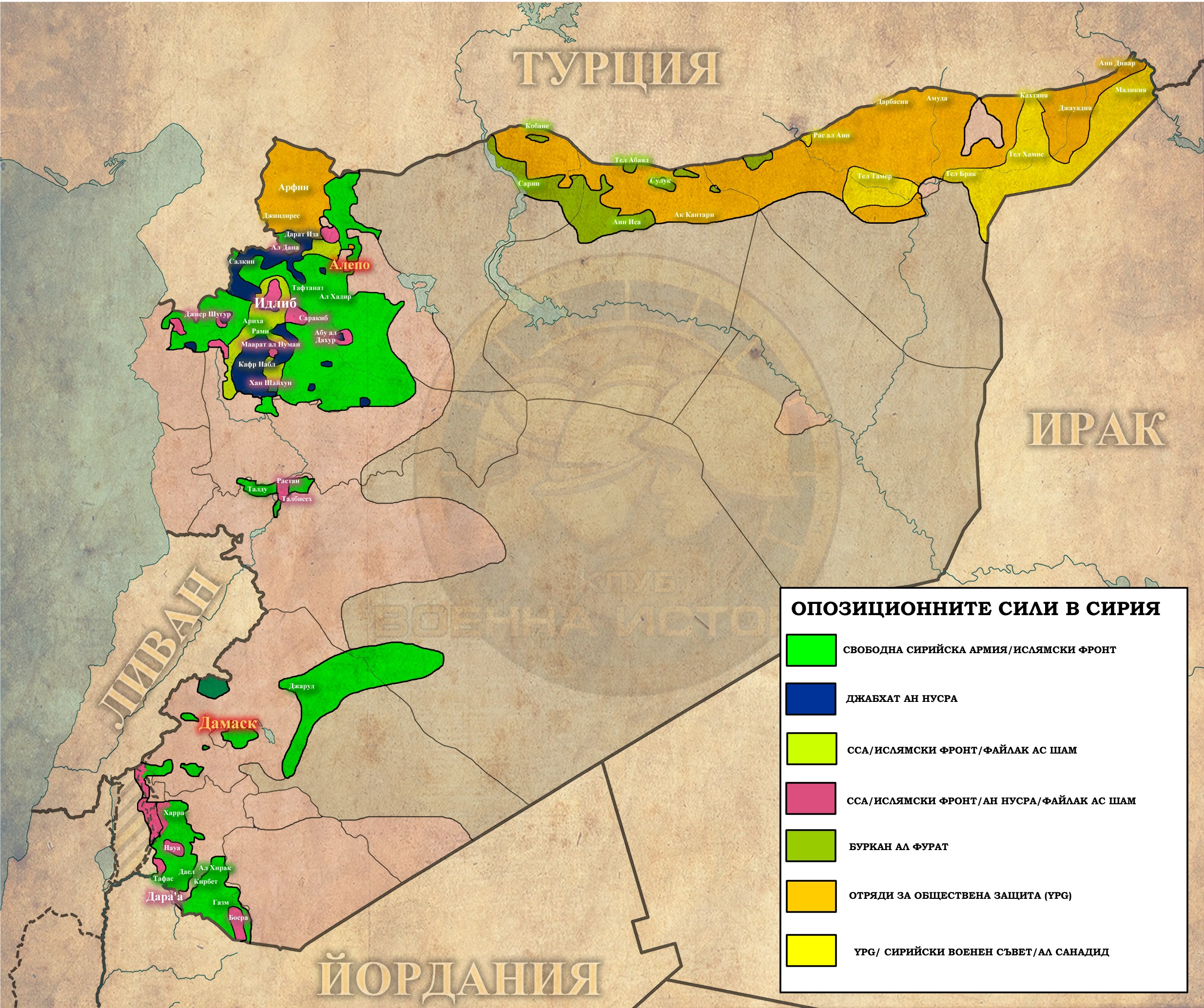 YPG (Отряди за обществена отбрана) – Основните бойни сили на Сирийски Кюрдистан, YPG наброяват около 50 000 души, включвайки в състава си основно кюрди, но също така и турци, араби и разнообразни по произход контингенти от западни доброволци. Целта им е да защитят и консолидират всички територии с преобладаващо кюрдско население в Сирия. Основният им враг е Ислямска Държава, но на няколко пъти до сега кюрдите са се сблъсквали със сили на Асад, мака официално да не са се се конфронтират с правителството.