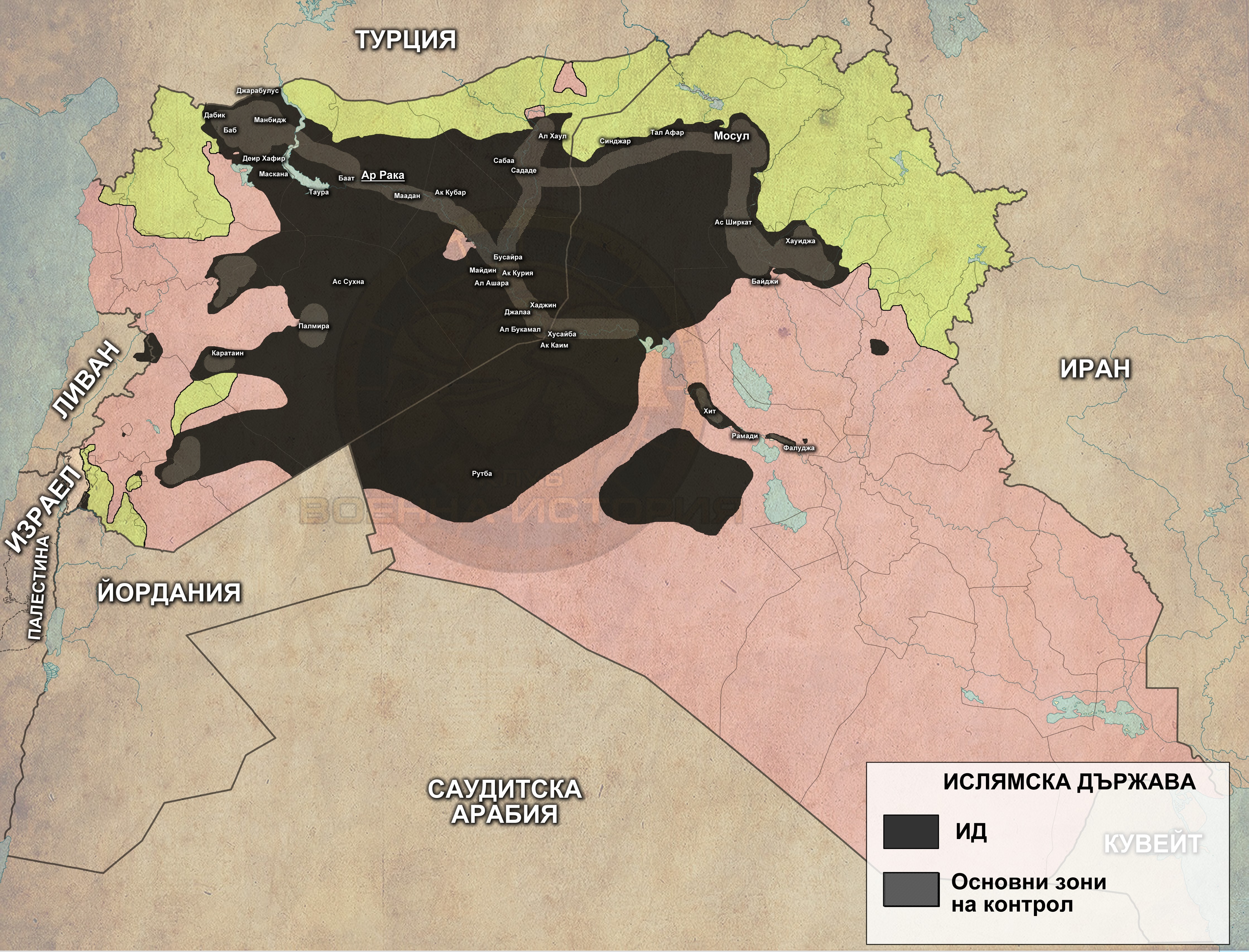 Обратно в зоната Сирия-Ирак, Ислямска Държава притежава около 45% от Сирия и около 1/3 от Ирак, предимно пустинни зони, доста от които, обаче, богати на нефт. Според най-общи сведения, под ботуша на Даеш живеят около 8 000 000 души, а армията на организацията вероятно наброява около 50-60 000 редовни бойци и вероятно още толкова обучаващи се. Тези сили са разхвърляни върху поредица от фронтове, сражавайки се срещу всички останали фракции в региона, като към момента, основните им опоненти се явяват кюрдските милиции (YPG и пешмергите) и ССА в района на Алепо. Допълнително, тежки боеве се водят със сирийската армия в района на Деир ез Зор и Палмира, а с иракската – около Фалуджа, Байджи и Рамади.