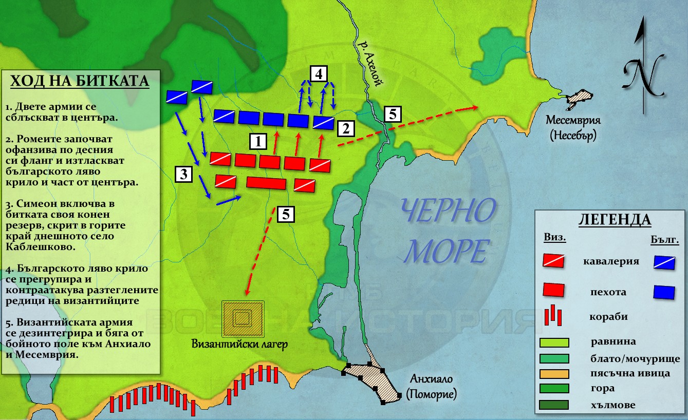 За разлика от хиперболизираната численост на армиите, ходът на битката може да бъде възстановен относително безпроблемно по наличните извори. Двете армии се среща северно от град Поморие, западно от р. Ахелой. Ромеите се строяват успоредно на морето, като град Поморие остава зад гърба им, както и лагерът им. Българите заемат височините западно от р. Ахелой, като Симеон оставя някаква част от кавалерията си в резерв на своя десен фланг. Двете армии започват битката, като ромеите постигат значителен превес в началото. Според византийските източници първоначално силите на Лъв Фока буквално разбиват българите, но такова заключение би било прибързано, особено с оглед на бележката, направена от Йоан Скилица, който отбелязва, че българите, макар и надвити се изтеглили организирано. В този ключов момент, византийските сили настъпват на североизток, преследвайки българите. Според легендата, представена от Скилица, Лъв Фока изпуска коня си докато пие вода от малък поток по средата на бойното поле, конят побягва и предизвиква паника сред ромеите. Идеята, че обучен боен кон ще избяга от господаря си и ще обикаля бойното поле хаотично няма никаква връзка с действителността. Нещо повече, ромейската армия е съставена от професионални войници, които няма да се хвърлят в бягство при вида на кон без ездач, пък бил той и конят на военоначалника, най-малкото, защото всяка турма от армията си има свой командир, който да я контролира в бой. Далеч по вероятно е Симеон да се възползва от разтеглянето на вражеската линия за да нанесе концентриран удар полевия ромейски фланг, който все още се бори да отхвърли българското дясно. Българската конница в резерв обхожда фланга на ромеите, разбива го и започва да нагъва центъра и десния фланг в класическа асиметрична маневра. Същевременно, лявото българско крило прекъсва организираното си отстъпление и преминава в контраатака. Самият факт че подобна маневра е възможна показва, че българските отреди са съставени от редовни, професионални войници, навикнали на маршове и контрамаршове. Обходът на българската конница по левия ромейски фланг отрязва пътя за бягство на византийците към Поморие и ги принуждава да се опитат да форсират р. Ахелой и да се доберат до Месемврия (Несебър). Именно в опита си да избягат към морето и да прекосят тинестата река, ромеите губят голяма част от армията си, която се дави или бива премазана от своите. Лъв Фока достига Месемврия (явно с коня си, след като надбягва българите) и се завръща с кораб до Константинопол, което му дава време да организира останалата част от бойците от тагмата и да се опита да пресрещне Симеон, който напредва към Константинопол. След победата, в български плен попадат мнозина ромеи, повечето от които са продадени по робските тържища в Черноморието.